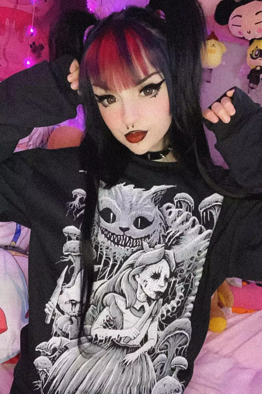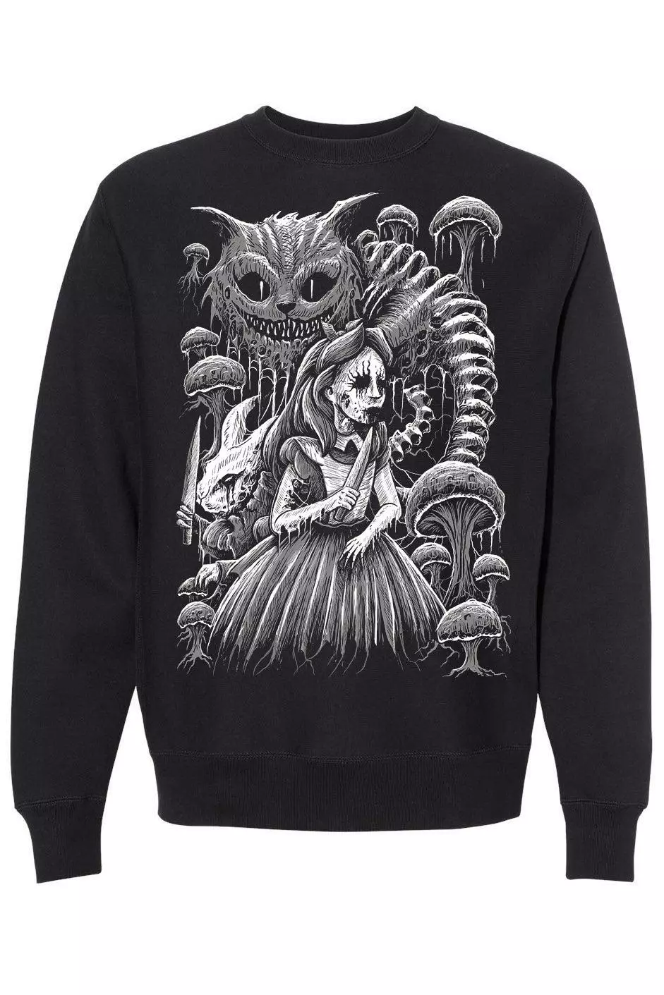 Murder your way into Wonderland in this sickening sweatshirt! Fall down the rabbit hole in the heavy metal design, featuring Alice and the White Rabbit haunting Wonderland with knives in hand. The Cheshire Cat lurks above them—his striped tail composed of spinal bones. Sinfully soft to please your wickedly whimsical heart.