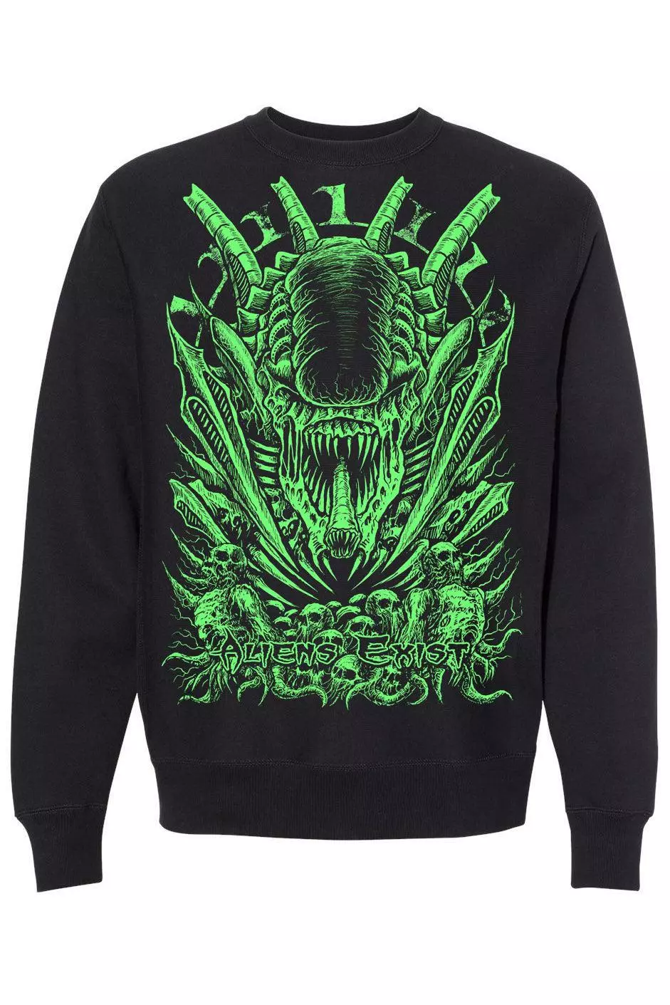 Show human meat sacks aliens exist in this extraterrestrial sweatshirt! Petrify onlookers with the shocking green design, featuring an alien about to devour its human prey. Keep invaders from outer space at bay with the Aliens Exist lettering, haunting a grave of webbed skulls and tentacles. Complete with VampireFreaks branding on the back.