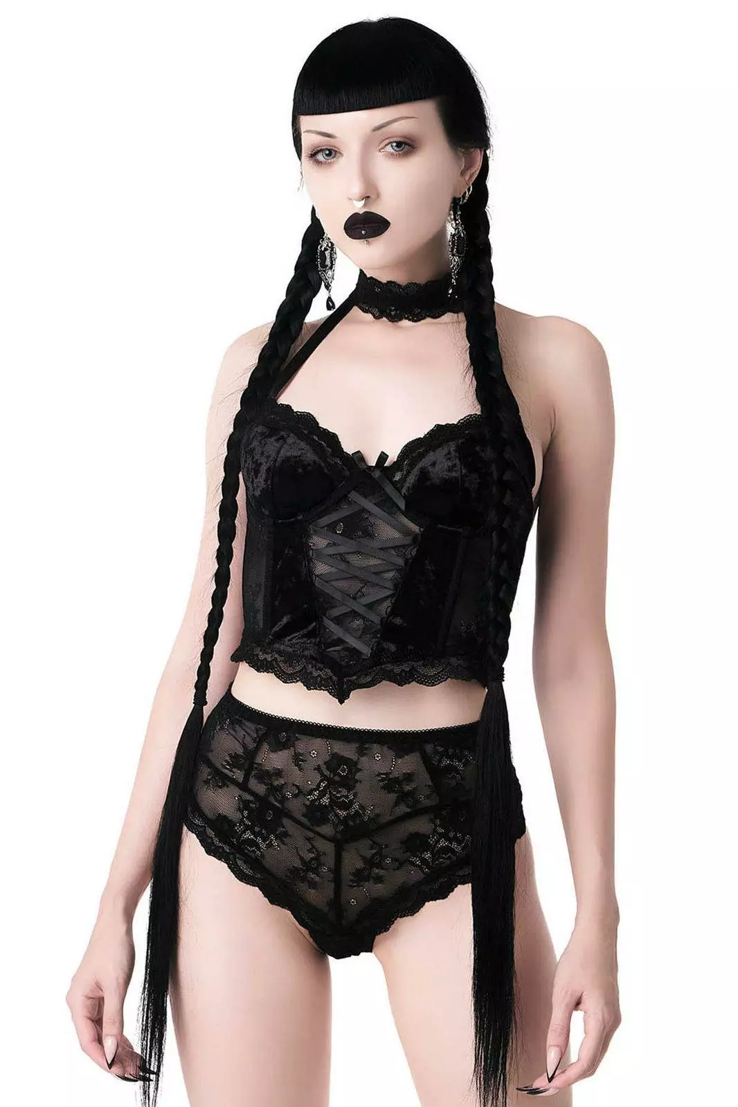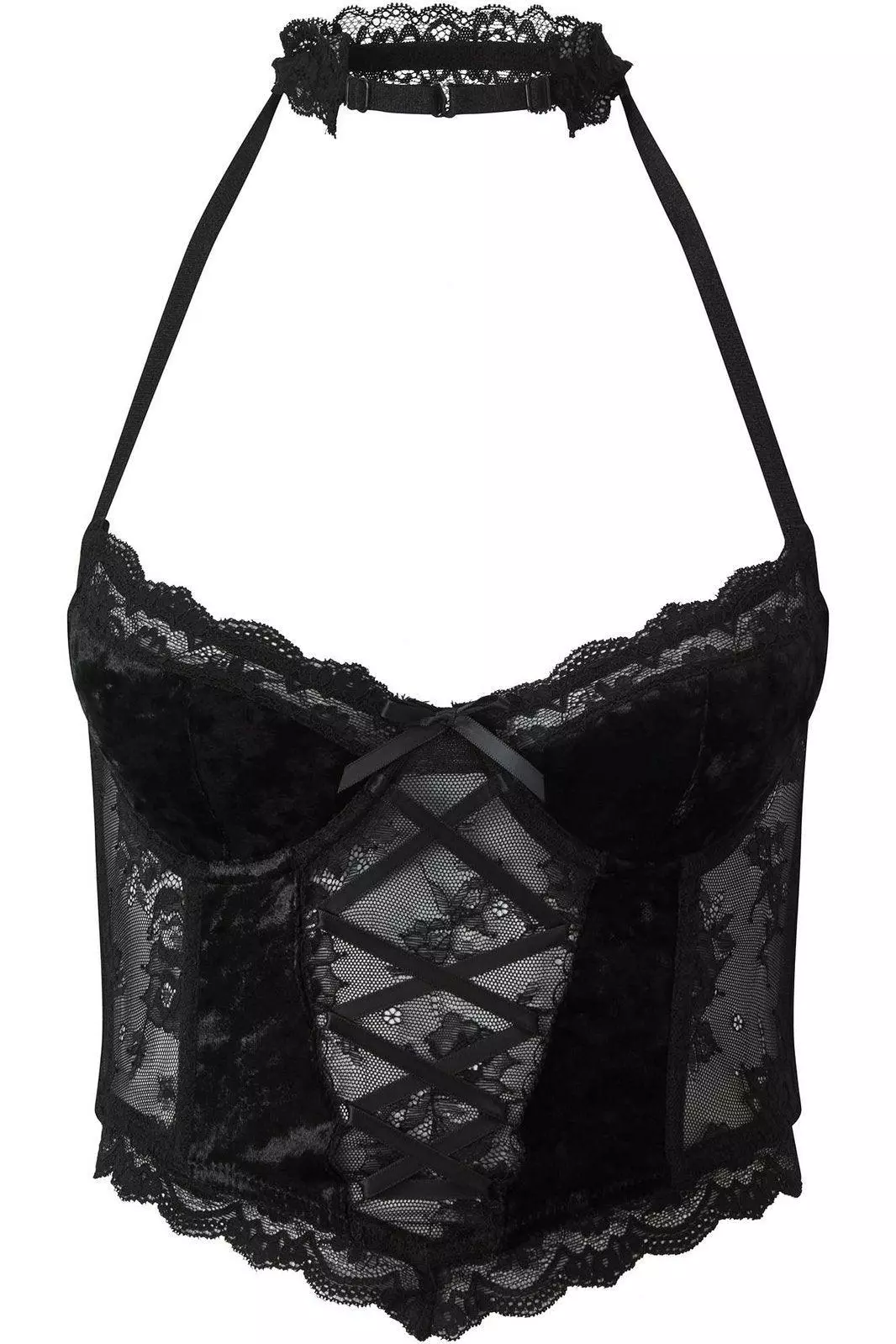 Which sin did you commit today? Fall in lust with our ‘Cardinal Sins’ Bralet and awaken yer inner temptress. Crafted using a super-stretch lace and delicately divine velvet for a sultry and flawless fit. No detail has been missed – finished with high neckline, intricate lace trims, lace-up detailing and a hook-and-eye fastening on the back. A bewitching statement piece – bound to make even the dark lord take notice.