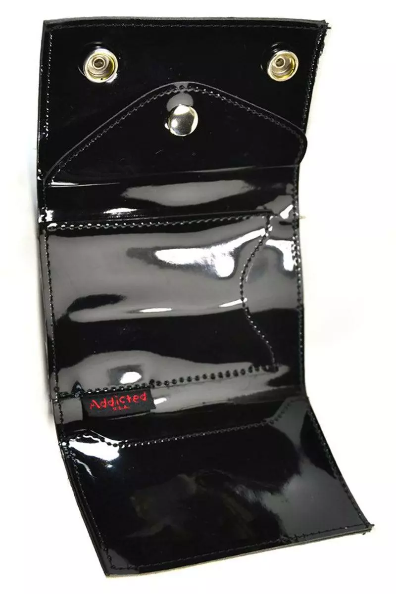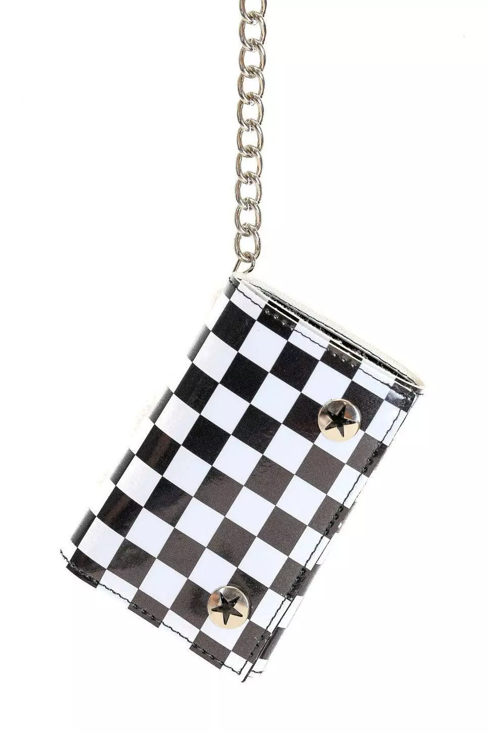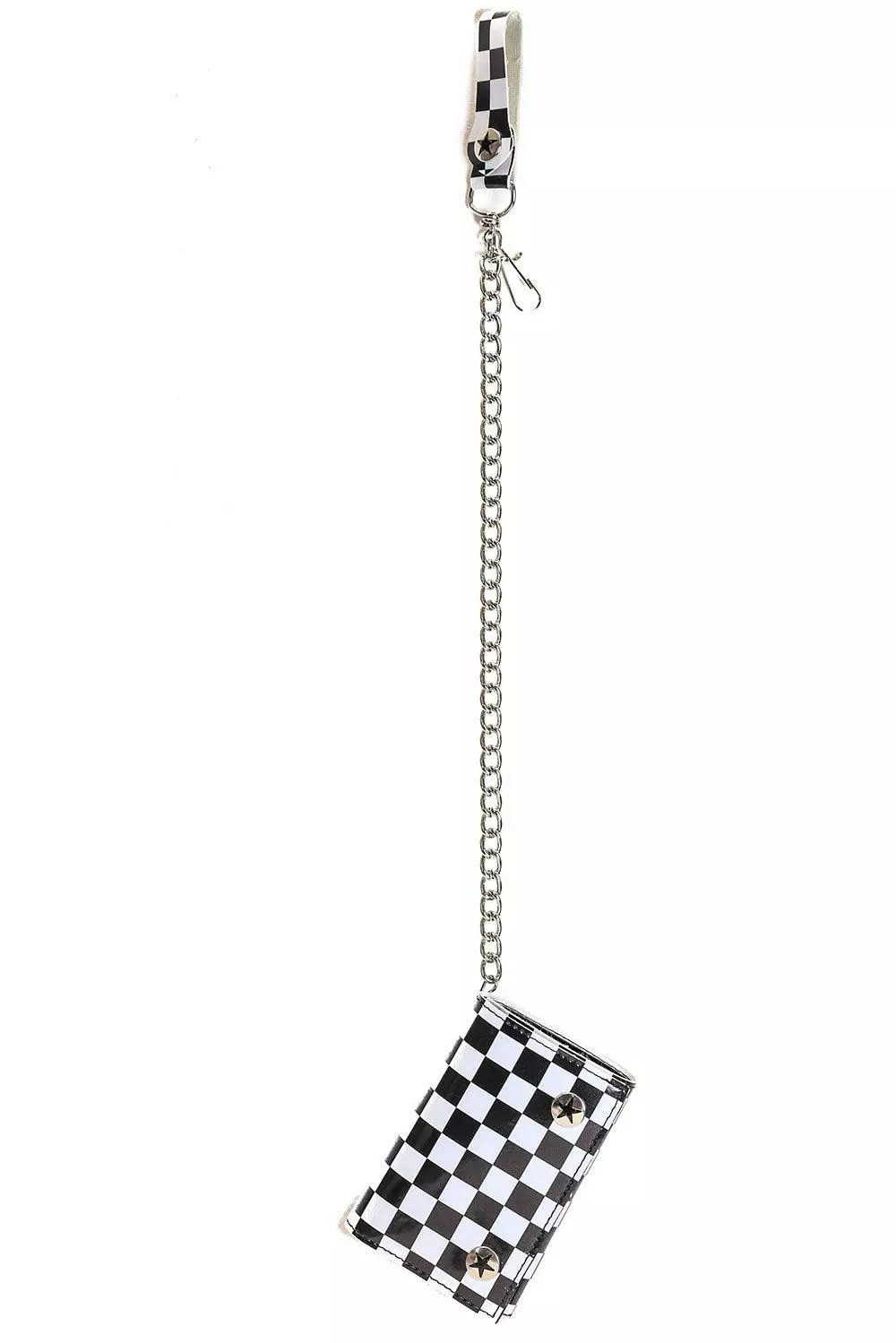 Punk out your monies in this wicked wallet! With a tri-fold construct, this checkered wallet has plenty of slots for holding your cards, cash, & change. A white and black checkerboard design possesses the front + back of the vinyl construction—silver buttons with star details snap on the front for a secure hold. Never lose your sh!t again with the silver chain and loop to attach to your pants. Hell yeah!