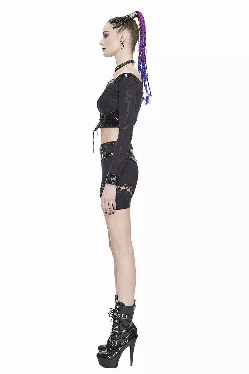 Slayyy in this sexy, deadly crop top. Conjure some gothic romance in the off-the-shoulder cut, v-neck, statement cuffs, and corset center. Black and beautiful, this long sleeve top features a discrete back zipper and metal eyelet hardware. Finished with vegan leather accents cause animal lives matter!