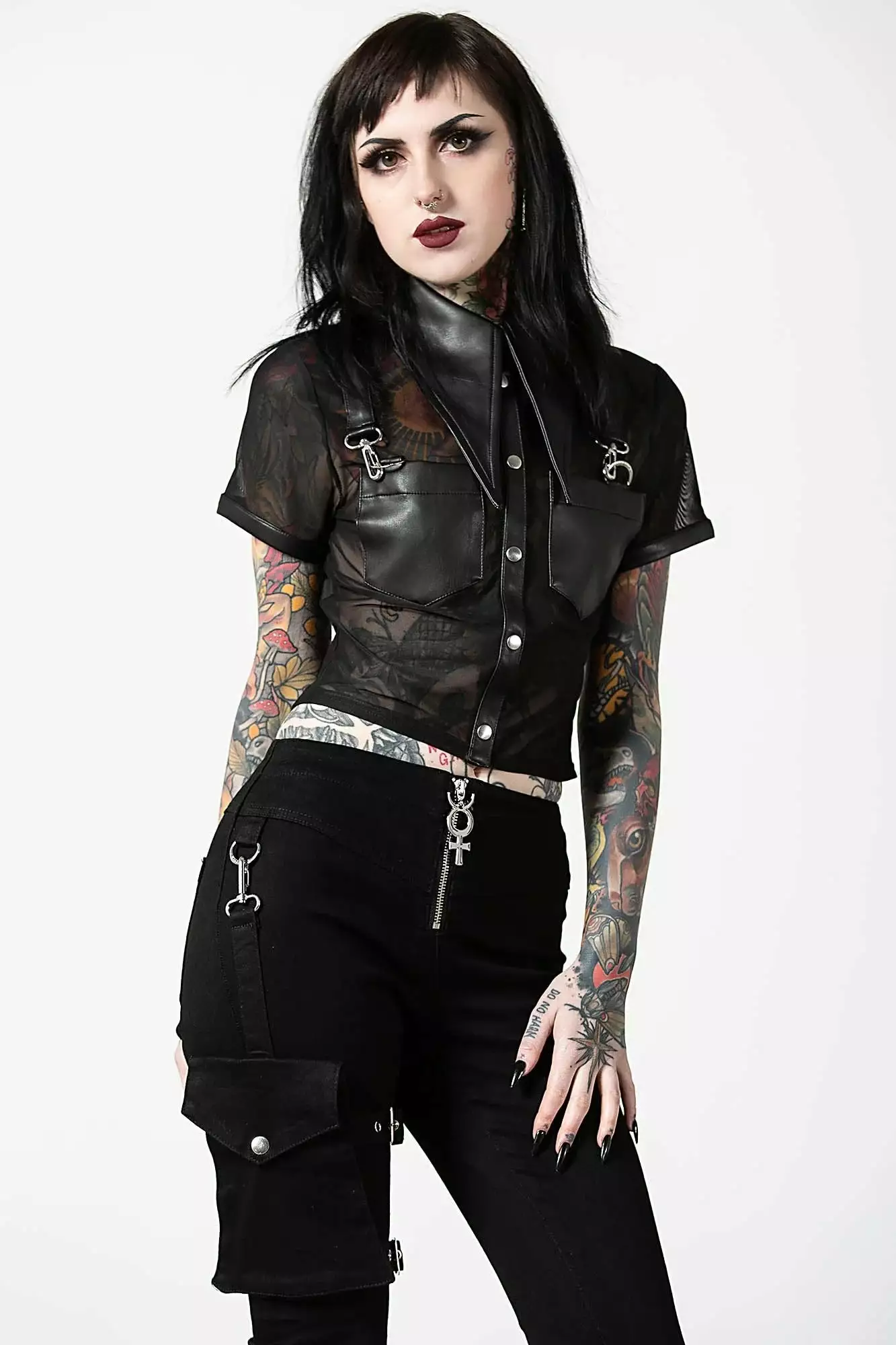 Wanna feel like the angel of chaos? Our ‘Dark Halo’ Crop shirt will certainly complete that look. Crafted in soft, stretch mesh fabric to give you the perfect figure hugging fit. Finished with an XL faux leather collar and trims, metal hardware and pockets – you’re set to look outta this world day or night.