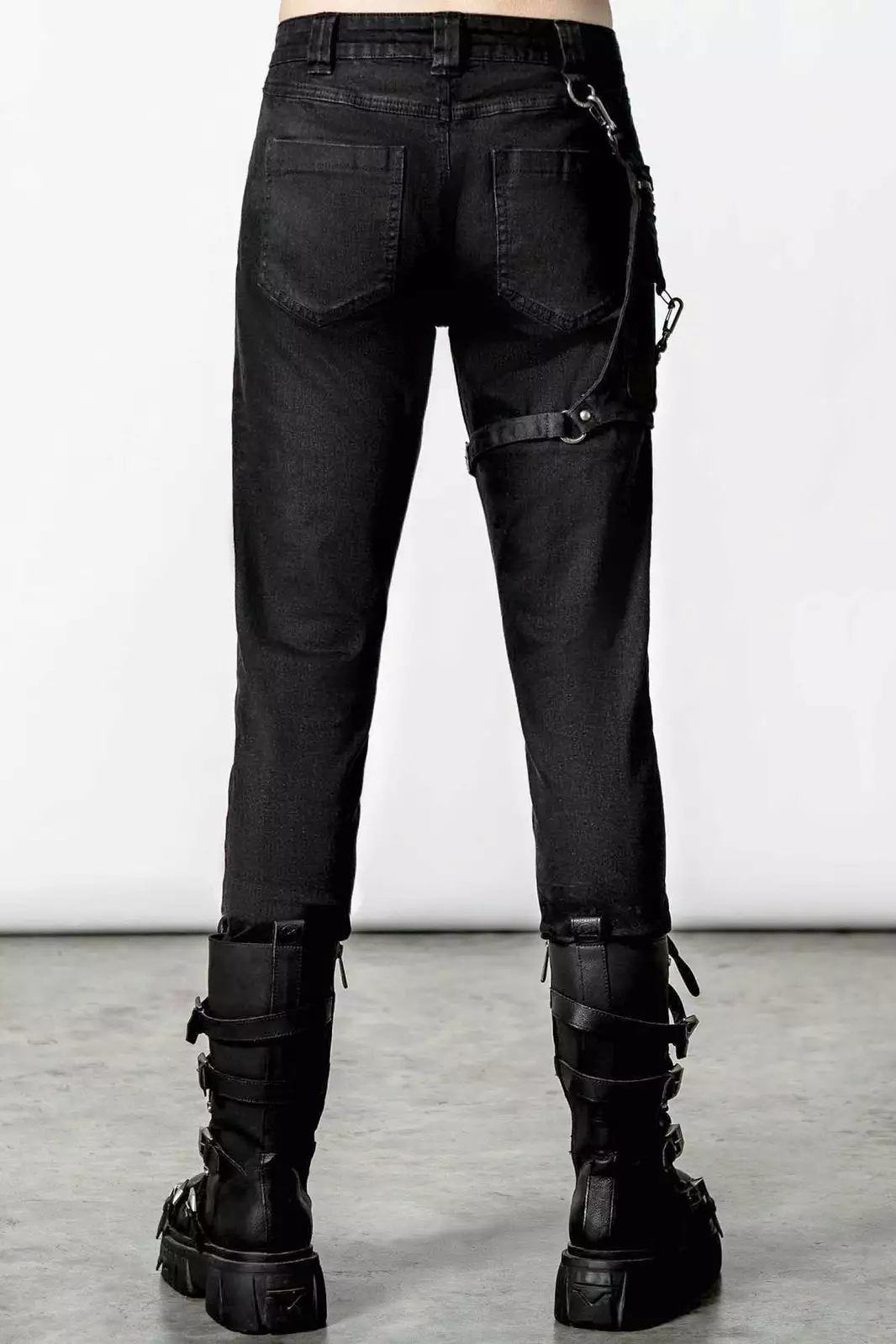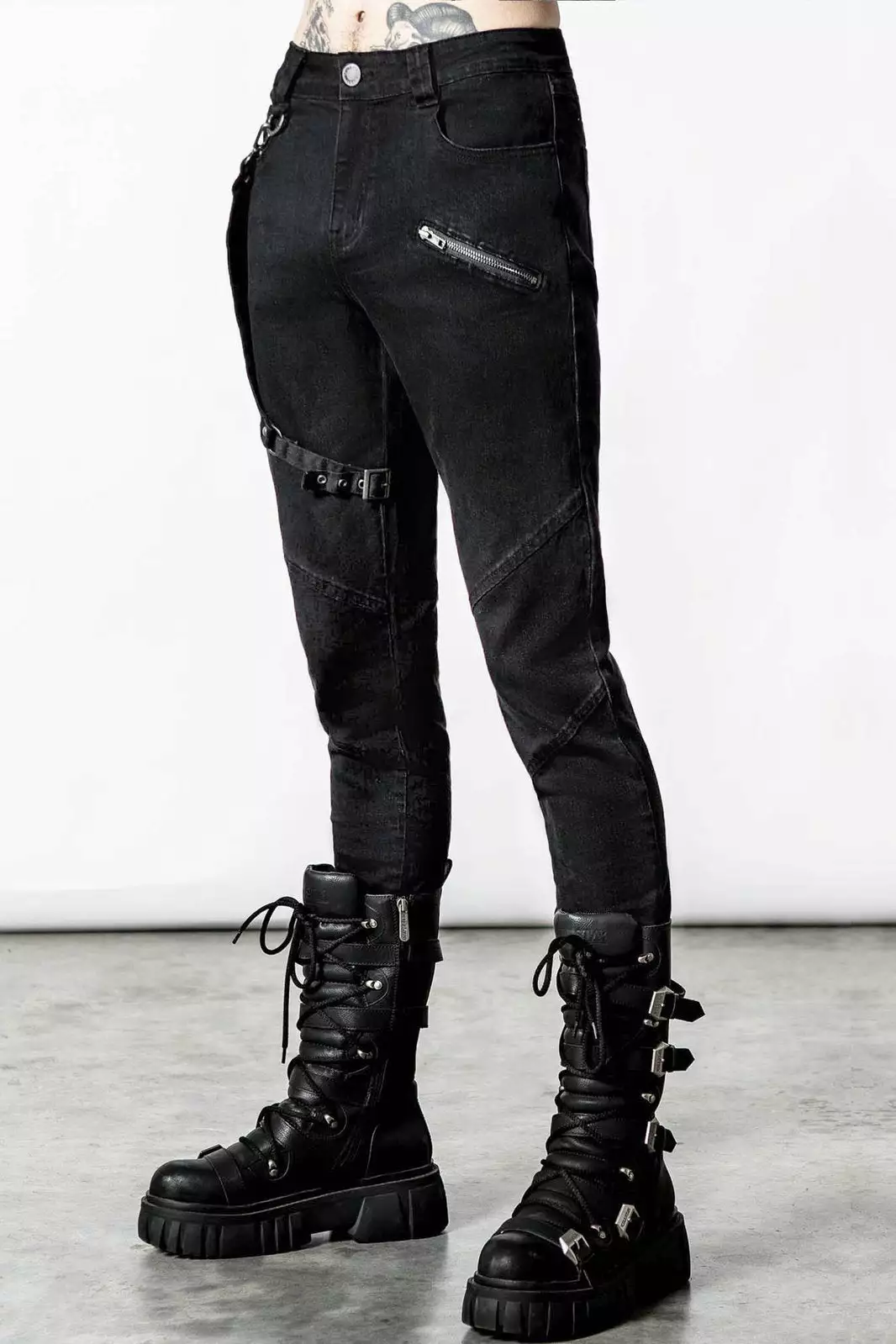 The ‘Decimation’ jeans, featuring 5-pocket styling, zip fly, belt loops and detachable pocket. With distressed details and zips.