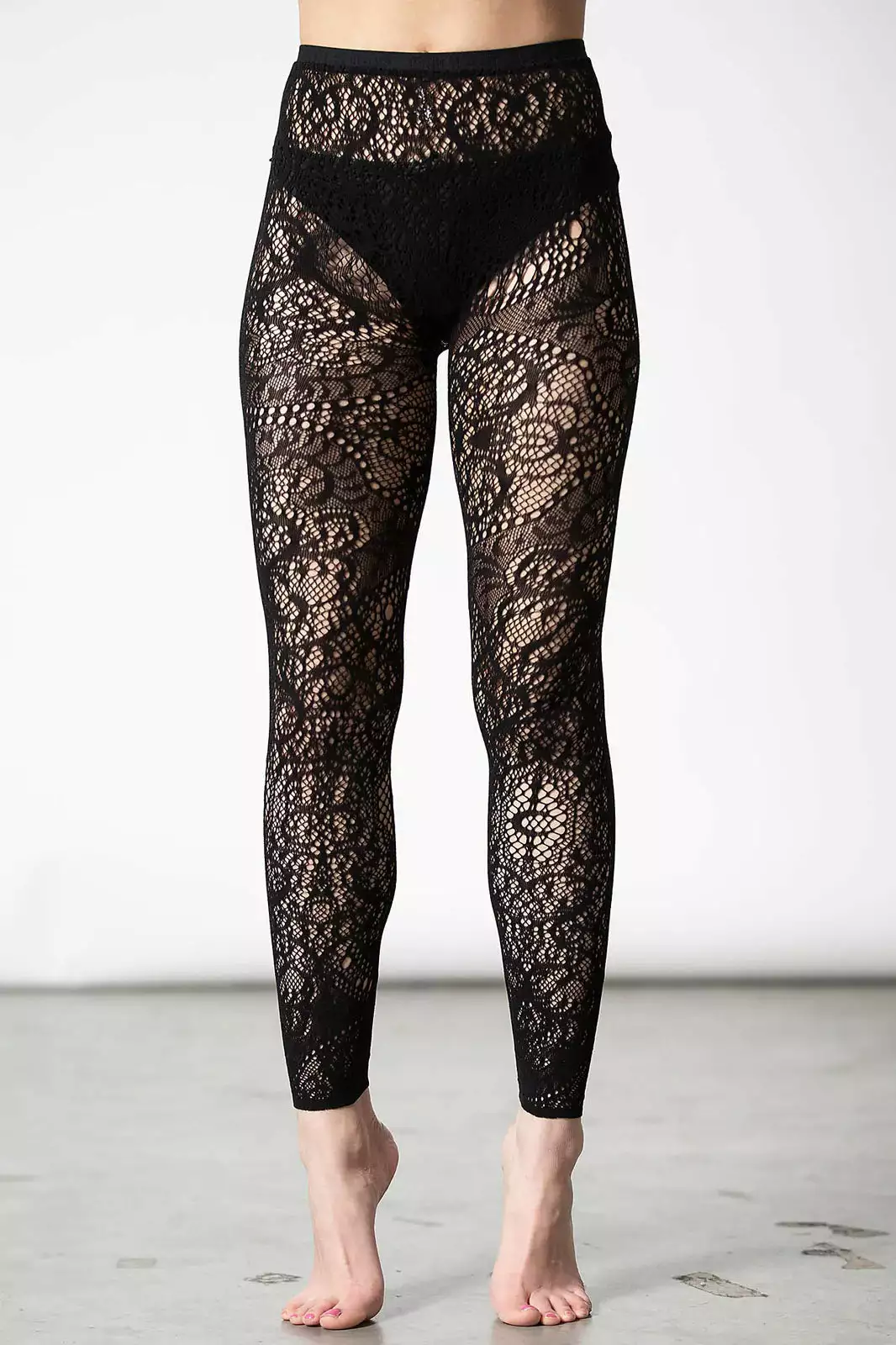 One dash of romance and one big helping of unfiltered darkness. The ‘Empyrean’ statement lace-leggings will make your dark heart flutter. In a silky smooth nylon-blend with just the right amount of detail, finished with a black-on-black branded waistband. Suits every mood/moon with ease; simply magical!