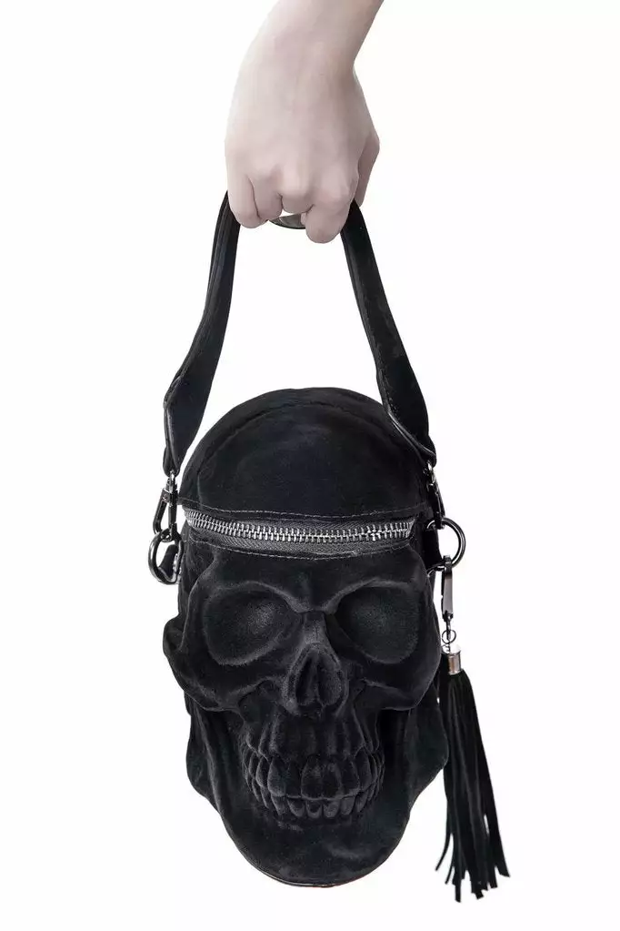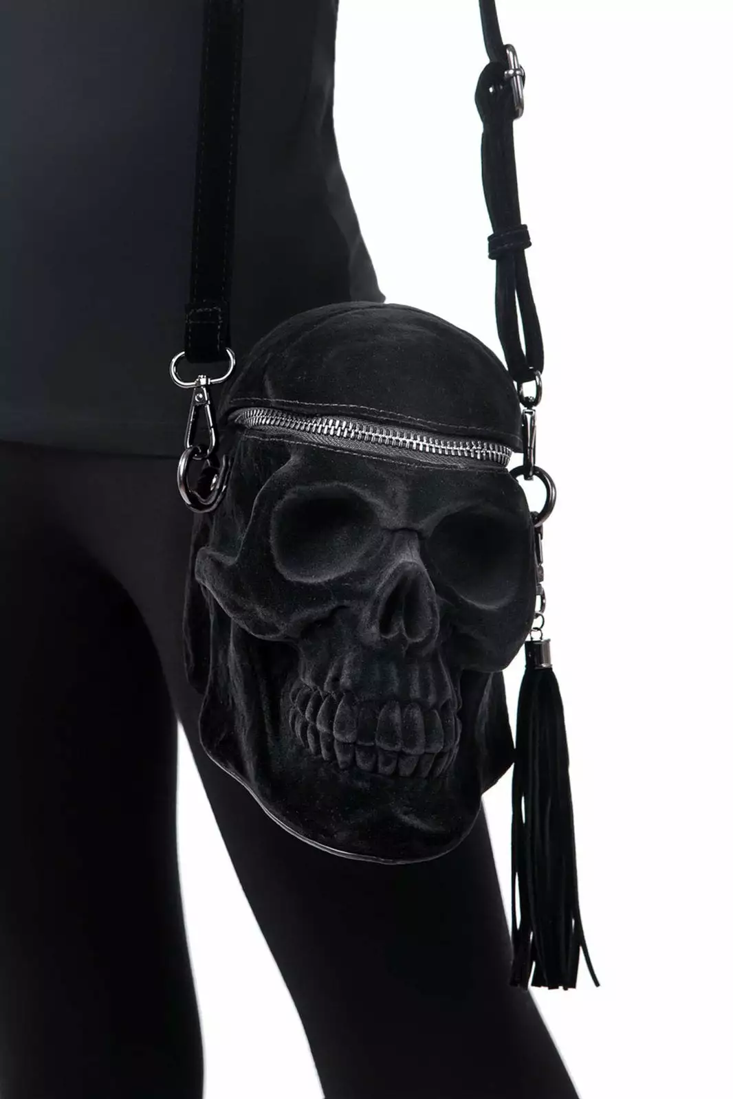 Welcome our newest skull member, in lush velvet coating! The ‘Grave Digger’ handbag is yer creepy must-have – large human skull handbag – with intricate detailing, zip opening, long shoulder strap and detachable tassel detail. All Hail the Halloween Queen!