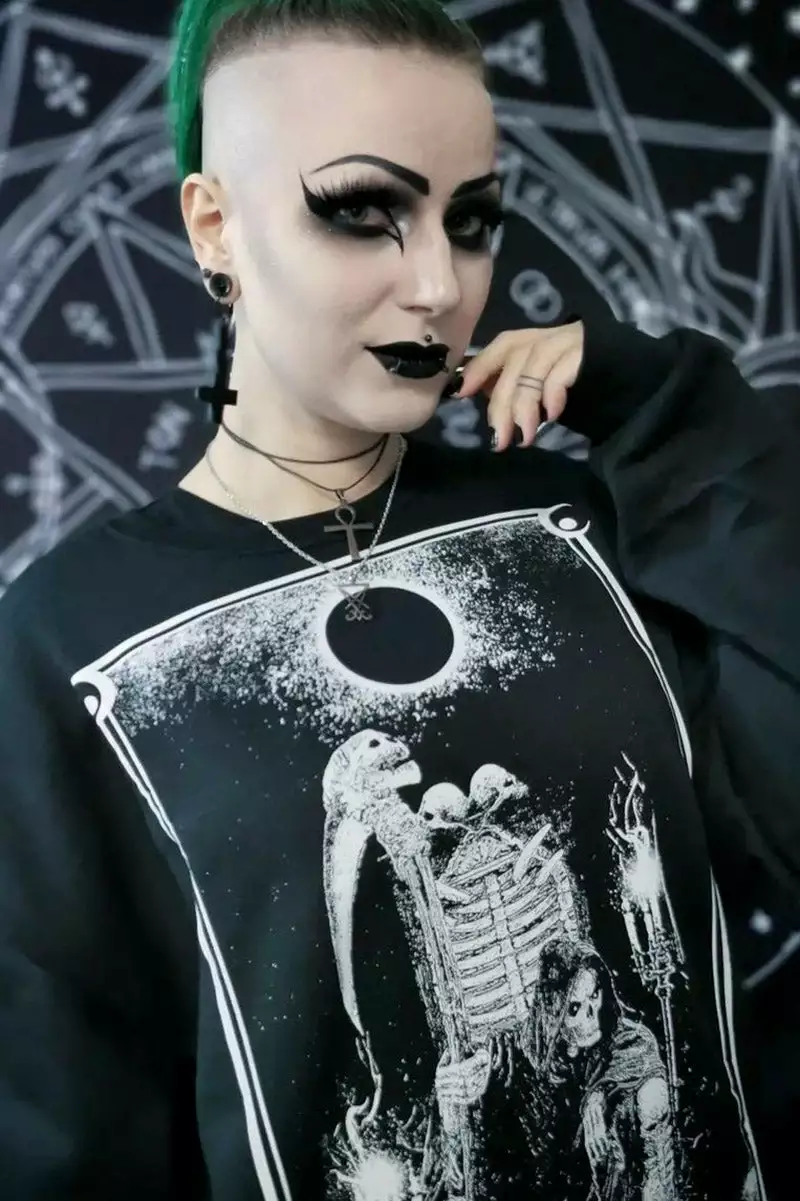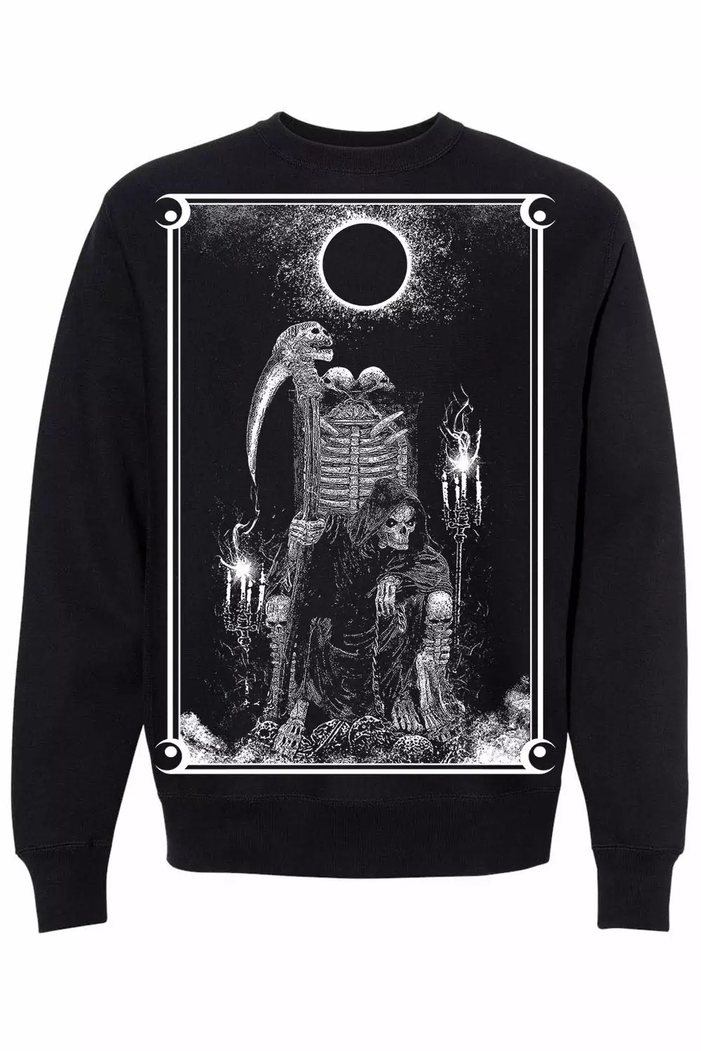Pay homage to the harbinger of death in this gravely gothic sweatshirt! The Grim Reaper sits on a throne of human bone, ruling over his domain of the damned. Candles flicker on the Reaper’s scythe, made from the remains of his enemies. A black moon rises above in the forever-night sky… for in the underworld, darkness reigns.Â