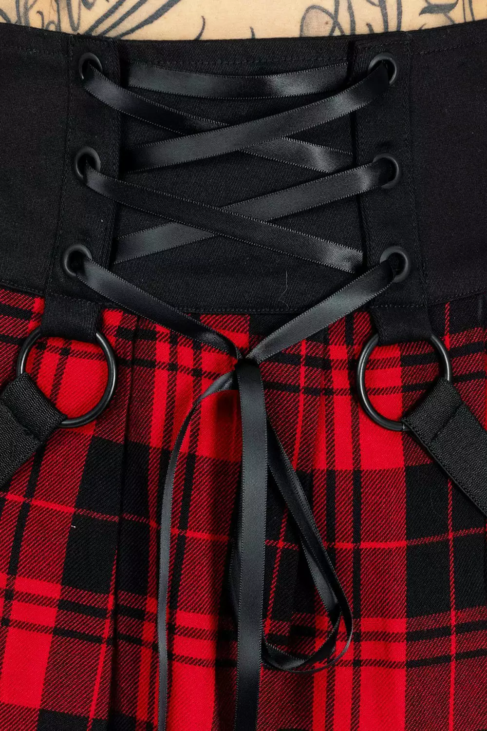 Cause some chaos in this punk pleated skirt, blood-red and black! Start a riot in the all-over checkered fabric, haunted with bondage straps and black metal hardware. Leave ’em breathless in the flattering fit, high-waisted with corset ribbon lacing down the front for a snatch waist. Pair with combat boots and stockings for ultimate bad ghoul vibes.