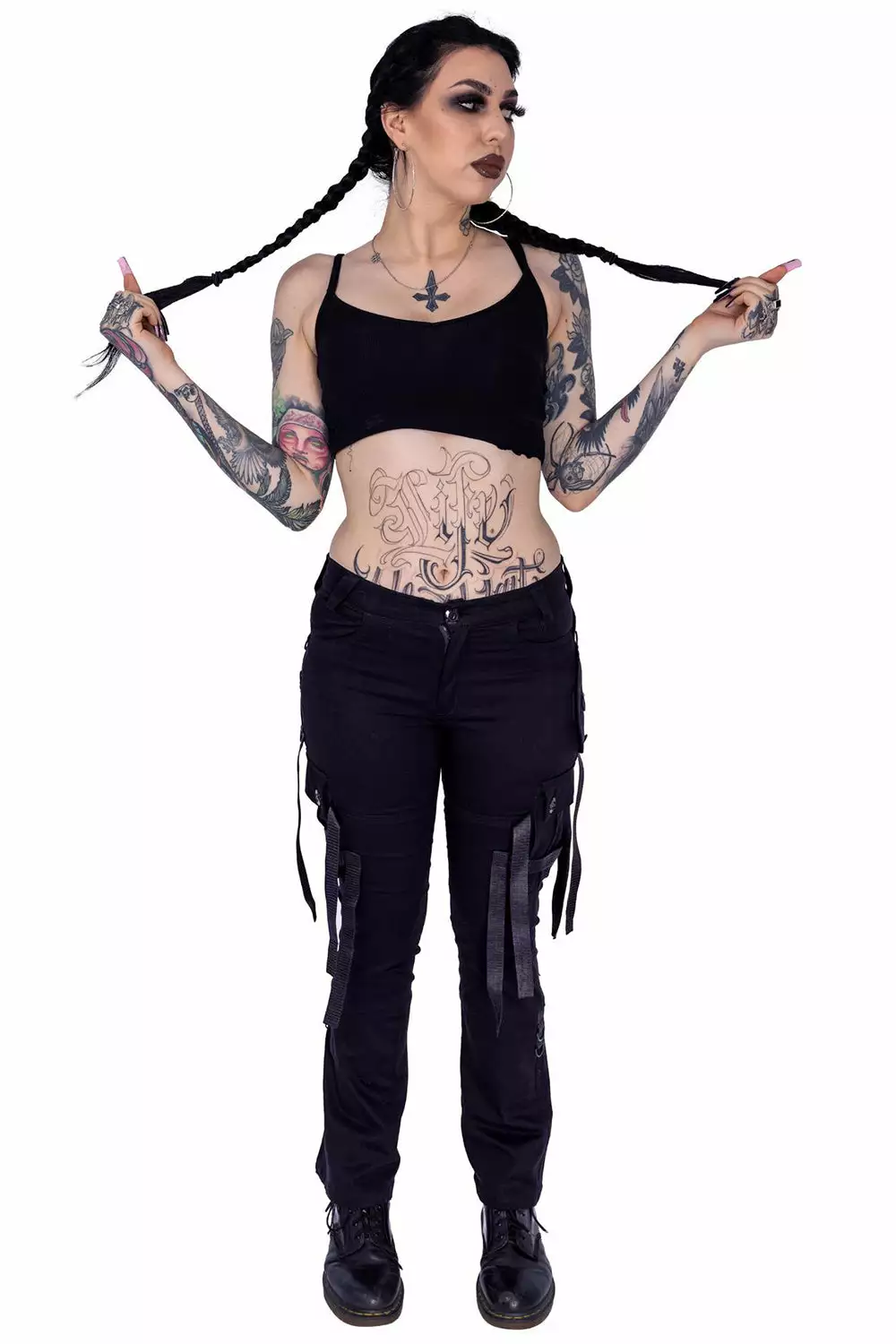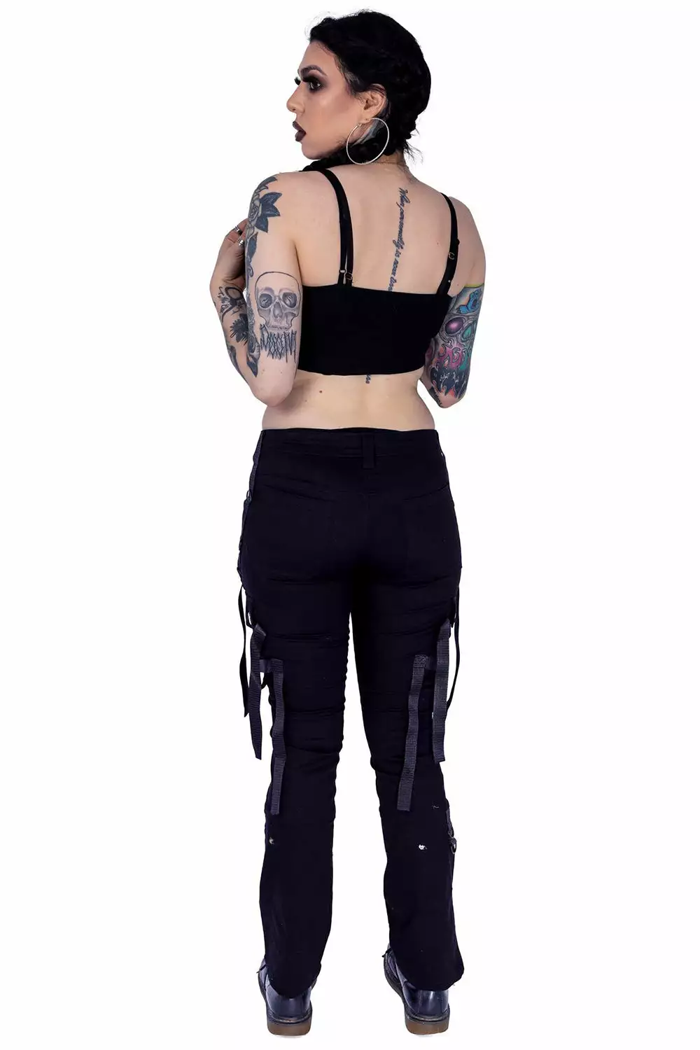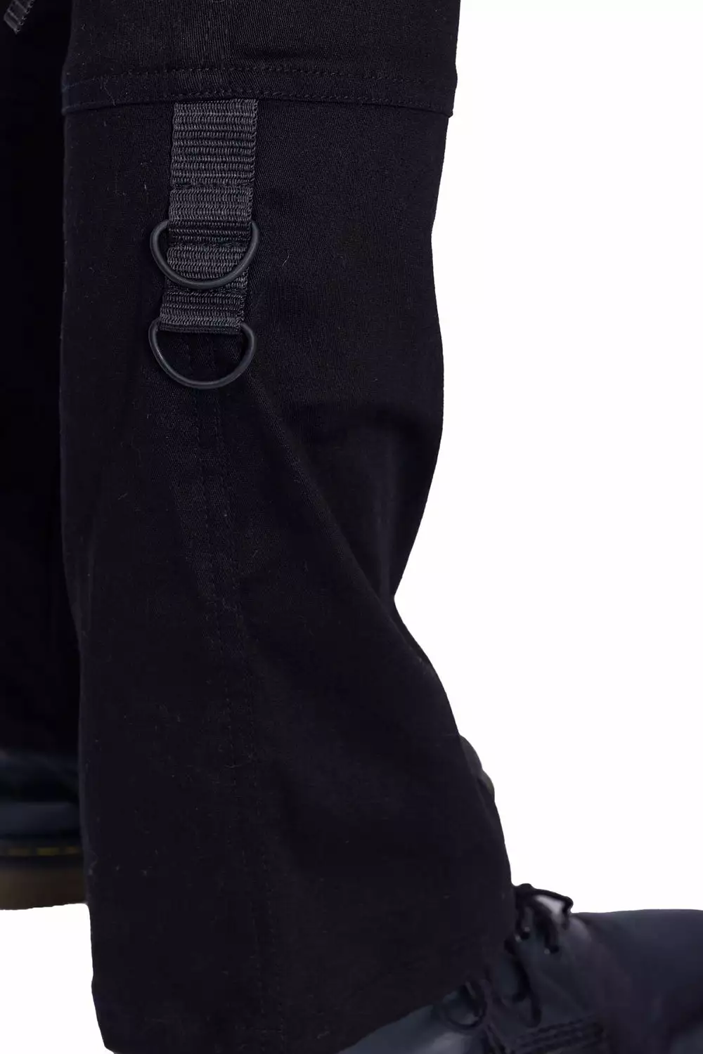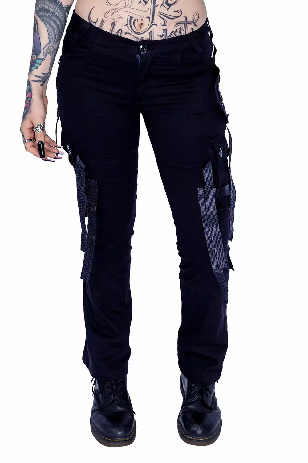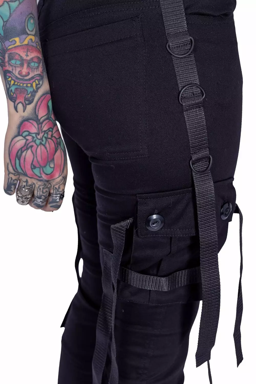 Harness the power of darkness in these hella cute street goth pants! Live your best baddie afterlife in the black metal hardware, accent straps, and 90s babe low-rise cut. Finished with cargo pockets for toting your smokes, lipstick, and tears of your enemies.