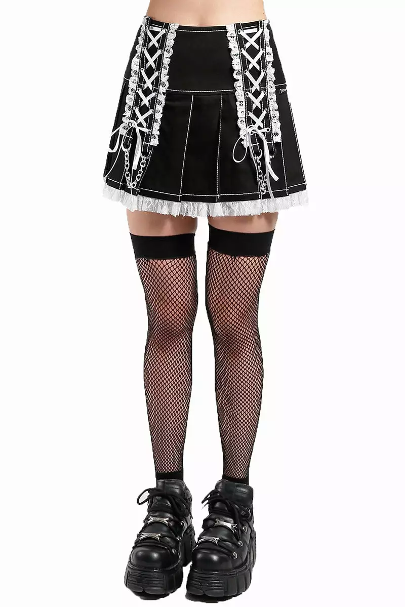 Conjure gothic romance to your alt style in this pretty pleated skirt, sexy and sweet as you! Made of 100% quality cotton, this gothic schoolgirl skirt features corset details and white ribbon lacing down the front. Catch glances and break hearts in the ruffle hem and frill accents. Finished with a discrete back zip closure.