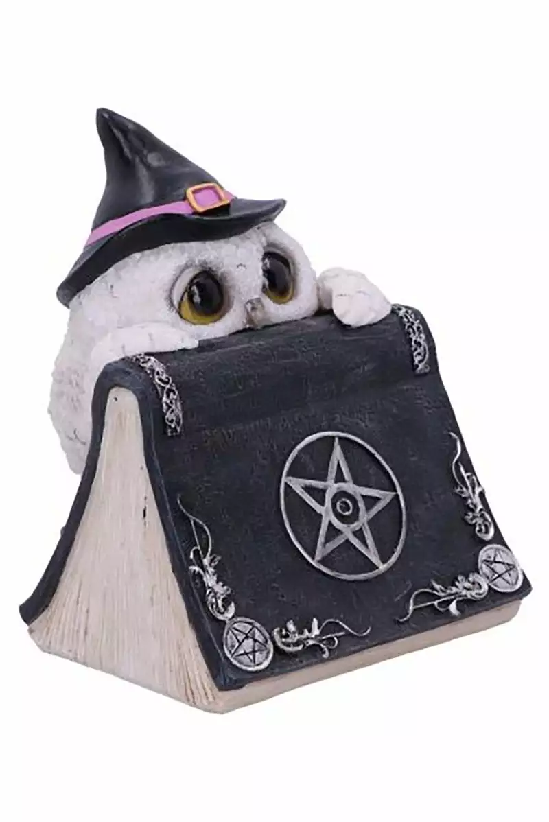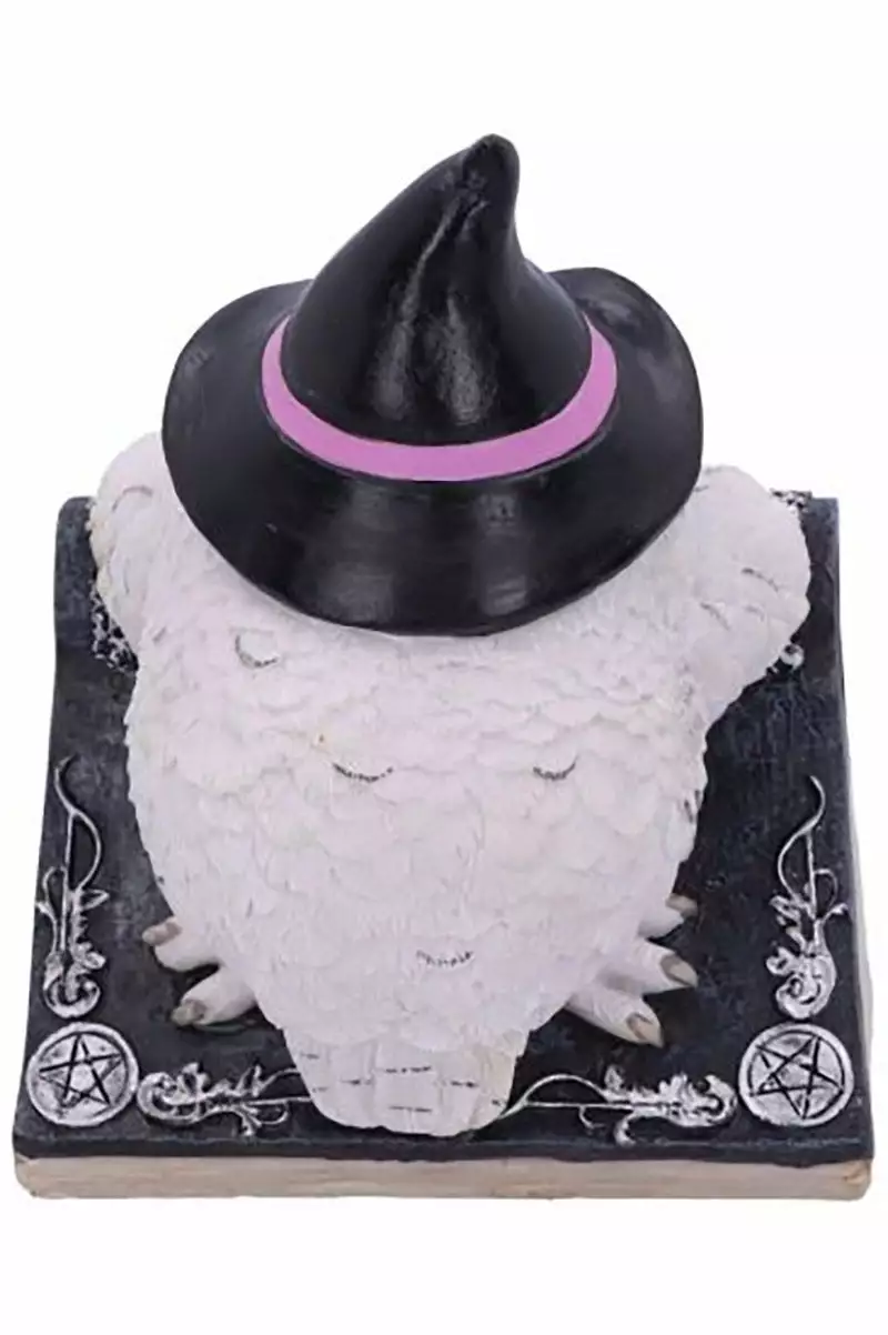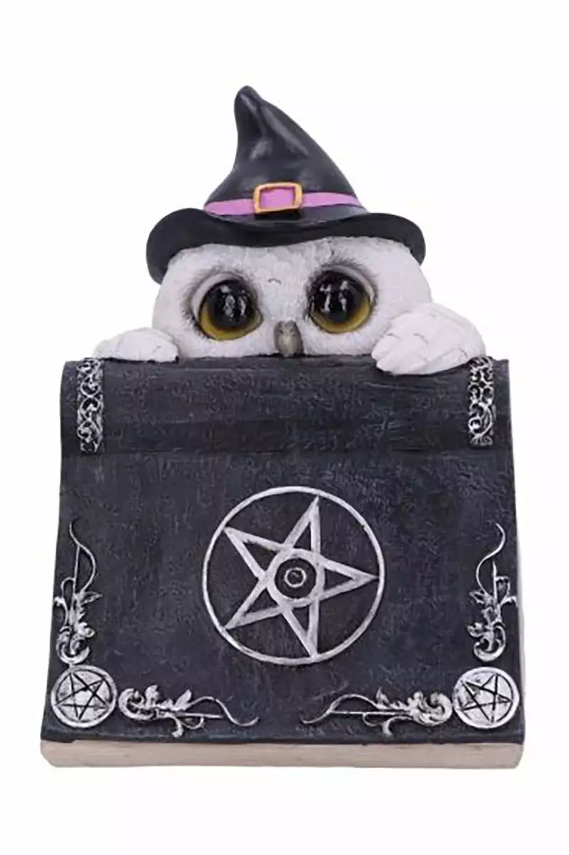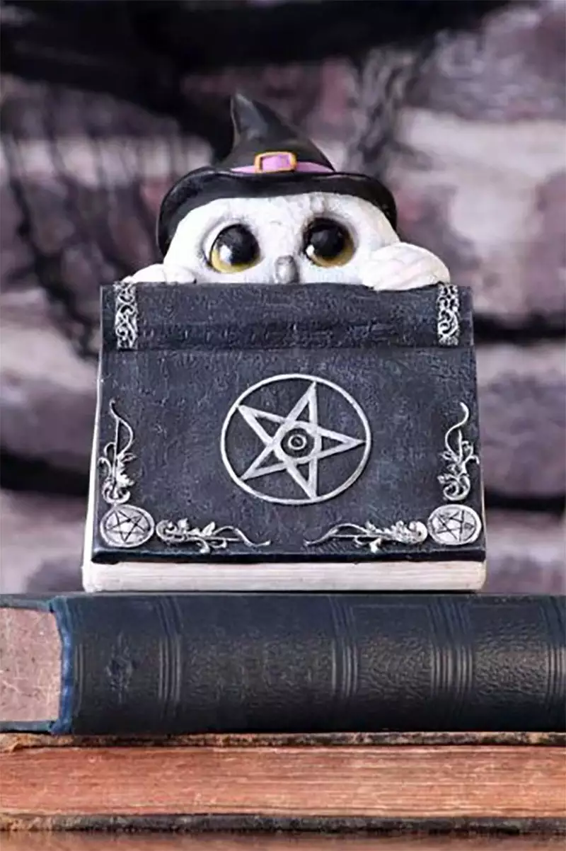 Make your home a magical place with this mystical statue! A witchy white snow owl peeks behind a spellbook, emblazoned with occult symbols and ornate detailing. A pointed, black hat rests on top of his little haunted head. Painstakingly hand-painted and hand-cast in the finest resin, this gothic figurine is perfect for decorating your alter, shelf, or curio cabinet!