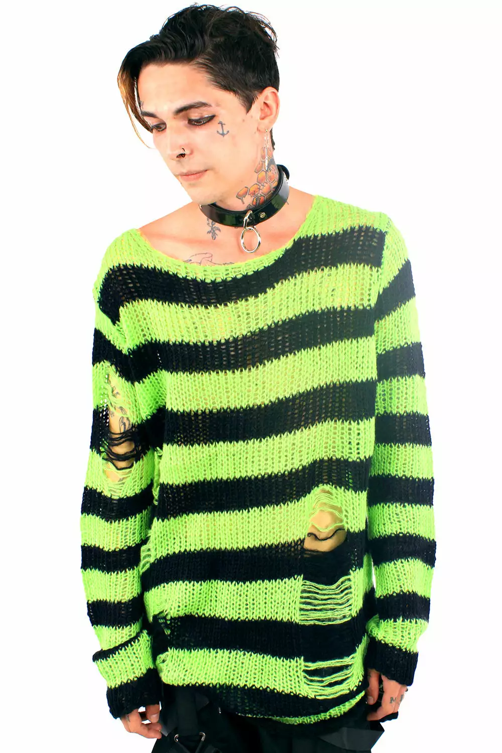 Commit lime crime in this sikk striped sweater! Be the highlight of their night in the contrasting green and black stripes, complete with distressed details and cozy knit construct. Wrap up in the exxtra long sleeves + length for exxtra drama.