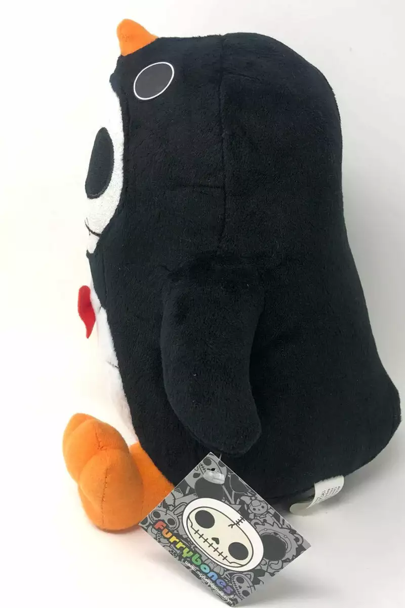 He’s dressed in his best penguin suit with his blood-red bowtie, big black eyes, and stitched smile. Pop him on your bed or rest him on your desk to add some spook to your room!