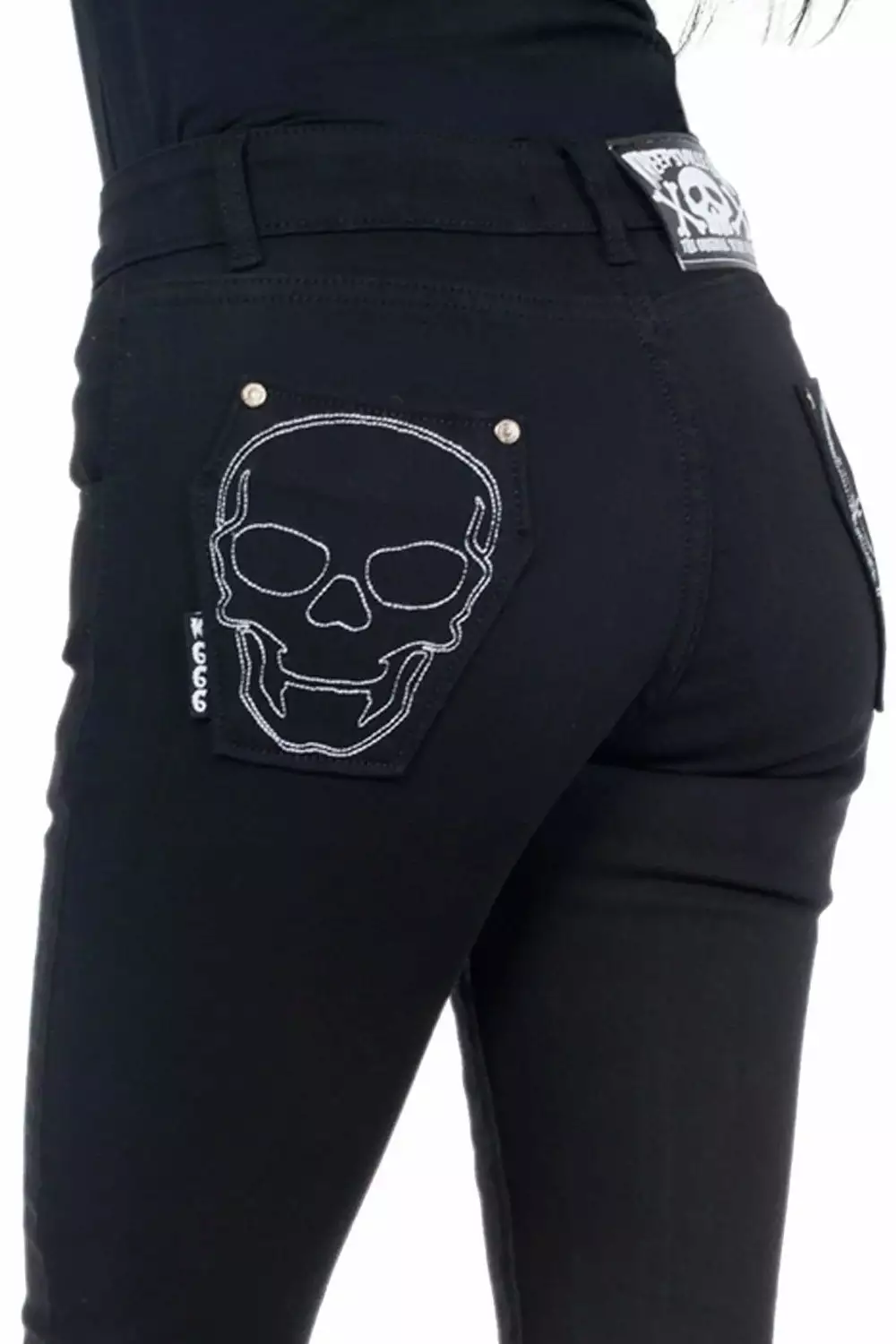 You give ’em femur in these sikk skeleton jeans, black & white and full of fright! Turn every day into Halloween with the distressed skeleton details on the front. Coffin-shaped pockets possess the back, complete with embroidered skulls! They won’t be able to keep their skeleton hands off you…
