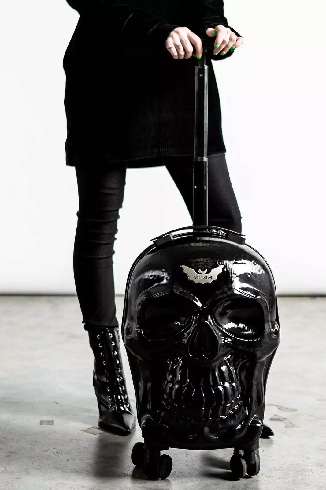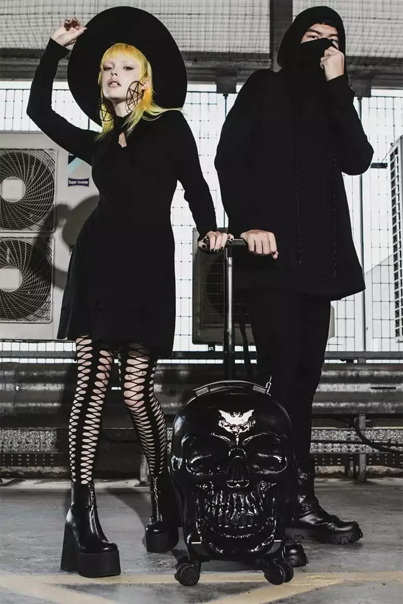 Bring a bit of magic on yer adventures out the crypt. Our ‘Tomb’ travel suitcase will sure cause a stir on your trips to Transylvania. Hard protective case in a custom skull mold, collapsible handle and four wheels so you can be on a constant roll. All black like your soul! With zip closure, multi compartments and just the right size for your carry-on.