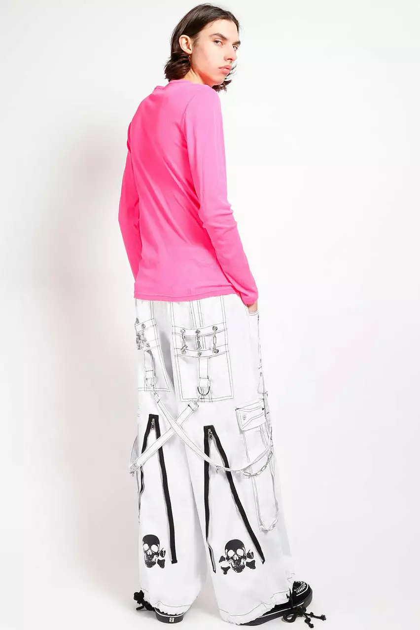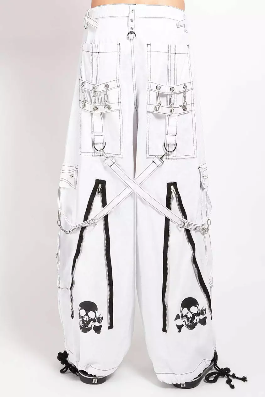 Emerge from shadow in these ghostly white Tripp pants, baggy with bondage straps! Black skull and crossbone elements haunt the backs of these statement pants, loaded with metal eyelet and silver chain hardware. Adjust the ankles & drawstring waistband till you’re comfy and creepy—zip up the pant legs for a change in fit! Perfect for dark souls unafraid of the light.