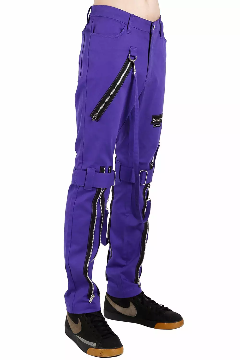 Be the one they won’t forget in these one-of-a-kind Tripp pants. Constructed of bright purple fabric, these punk pants bring the extreme with the contrast strips, D-ring hardware, and zipper details. Zip up the pant legs for a change in fit—remove the bondage straps for a lax look.