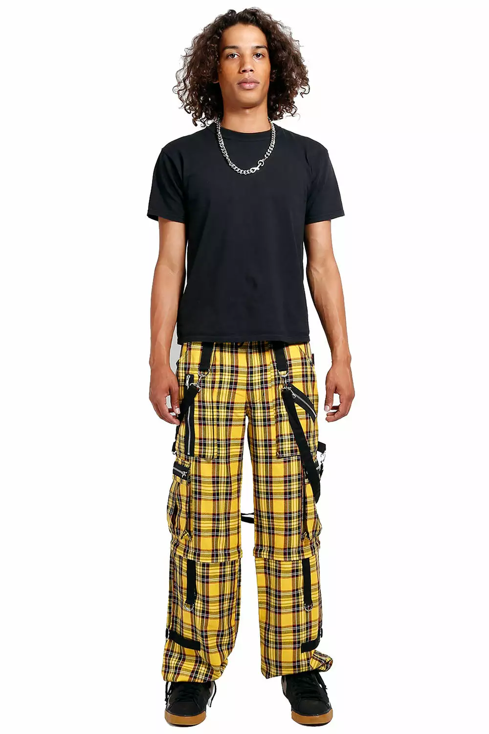 Fight the power in Tripp’s Clash Pants! Plaid-on-plaid, these bondage pants keep you looking hella cool while you blow minds and break hearts. Reject the mainstream with loud yellow print, silver zipper accents, baggy cut for comfort, and removable statement straps. From pants to shorts, you have the power! Zip off the bottoms to transform these Tripp pants into Tripp shorts!