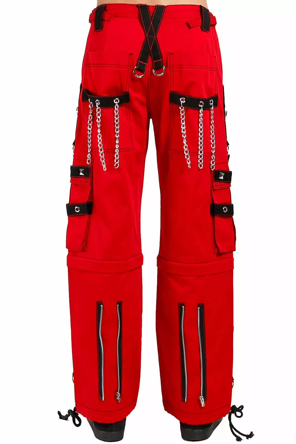 Turn up the heat in these fire-red baggy pants, loaded with an arsenal of metal hardware! Constructed of quality cotton, these lit Tripp pants are complete with black contrast straps, silver eyelets, pyramid studs, and statement chains. Adjust the ankles for a change in fit—zip off the pant legs to turn these Tripp pants into shorts!