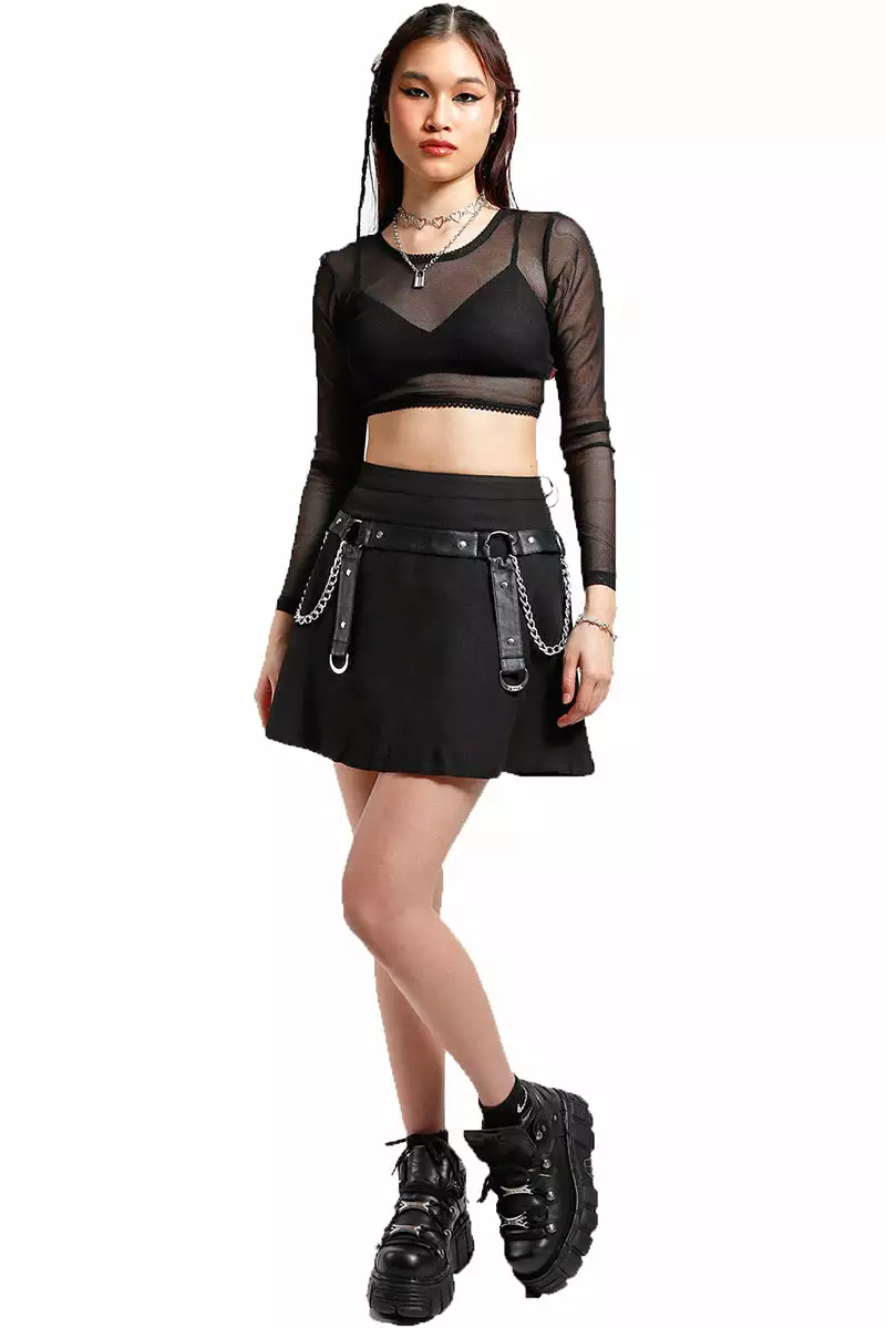 You’re the deadliest of them all in this darling skater skirt, beautiful and black as your soul! Flatter your figure in the high-waisted design, bewitched with an attached bondage belt. Be the spookiest chick in the room in the statement chains, vegan leather accents, o-rings, and d-ring hardware. Pair this gothic skirt with some knee-high stockings and crop top before you head out to haunt the night!