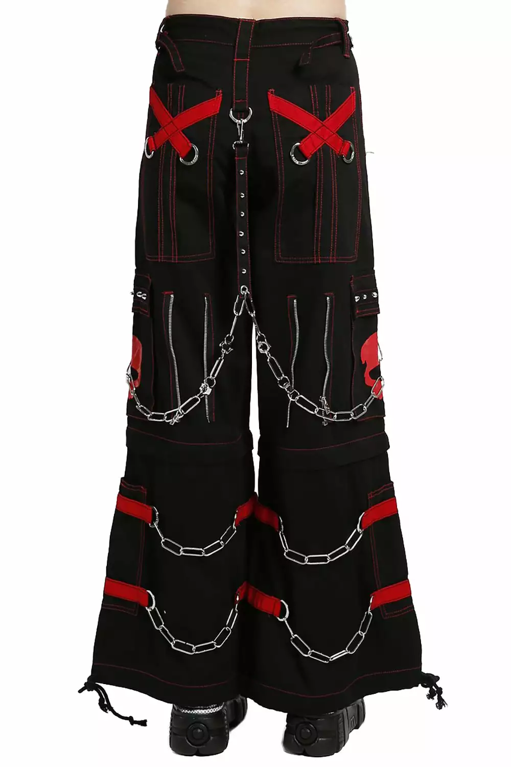 Defy death in these baggy bondage pants! Red accent strips and sinister skulls haunt the black cotton construct—silver chain hardware and metal zippers possess the front + back. Live your afterlife in comfy style in the drawstring waist and adjustable zippered legs. Zip off the pant legs to transform these Tripp pants into shorts!