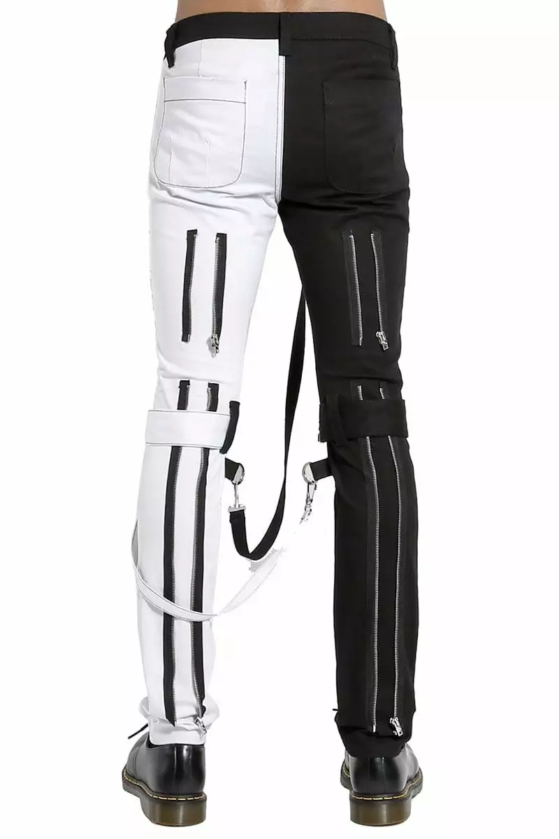 Live you best afterlife in these split leg pants—half black, half ghost white! Possessed with metal hardware, these punk pants feature detachable bondage straps, adjustable buckles on the knees, and accent zippers. Tote your evil essentials in the front and back pockets—zip up the pant legs for a change in fit… whatever your dark heart desires!