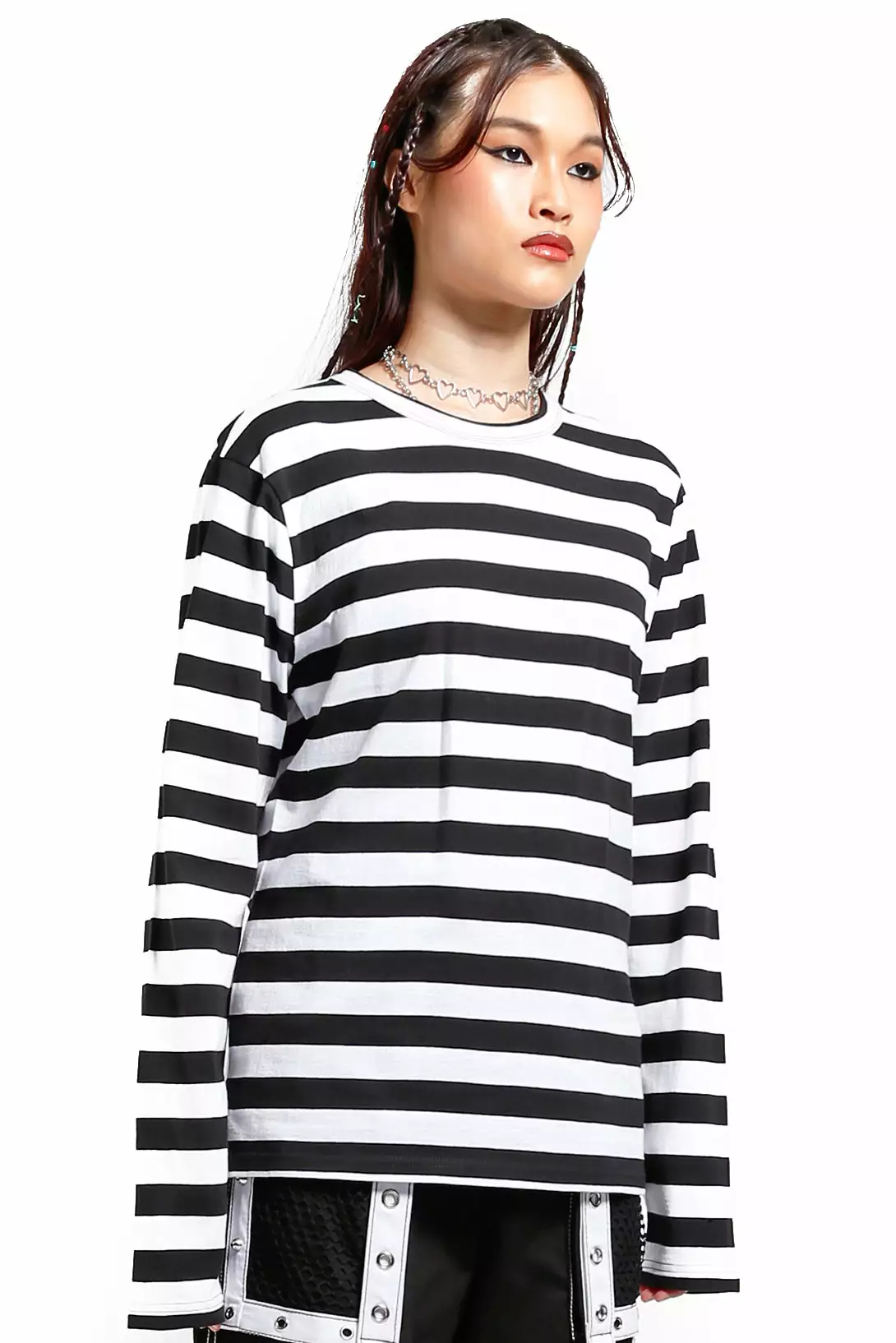 Invoke some emo with this signature striped shirt—an essential in every goth boy and ghoul’s closet! Made of high-quality cotton, this long sleeve tee features black and white stripes, a flattering fit, and super soft construct. Layer it under a band shirt, or rock it on its own… whatever your dark heart desires!