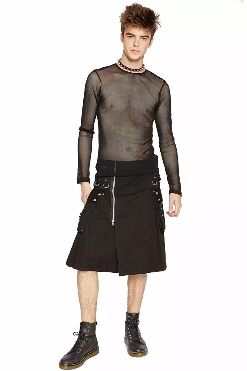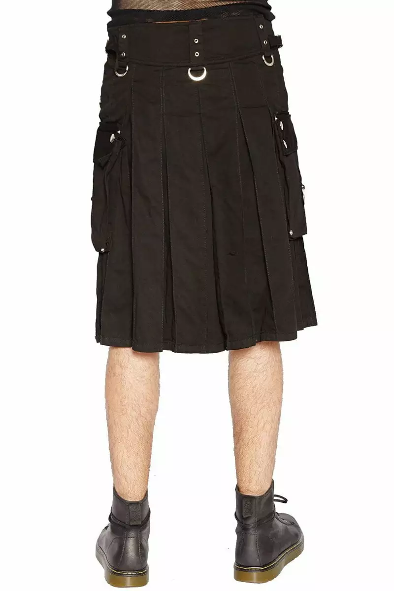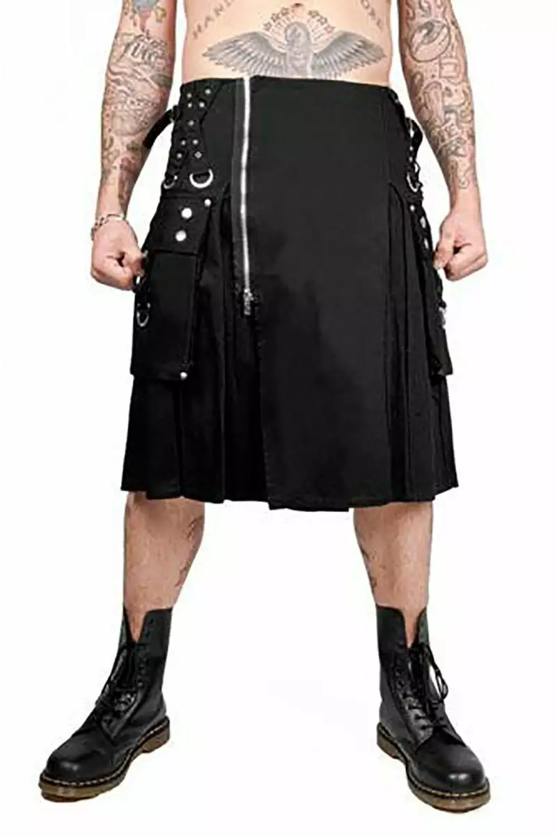 Made for the man on the move, this killer kilt honors the traditional Scottish skirt… possessed with punk rock! Harness your inner heathen with the easy front-zipper entry, large cargo pockets, and x-strap accents on the front. Pull strength from the shadows with the hardware details—metal rivets, grommets, skull buttons, and D-ring details all over.