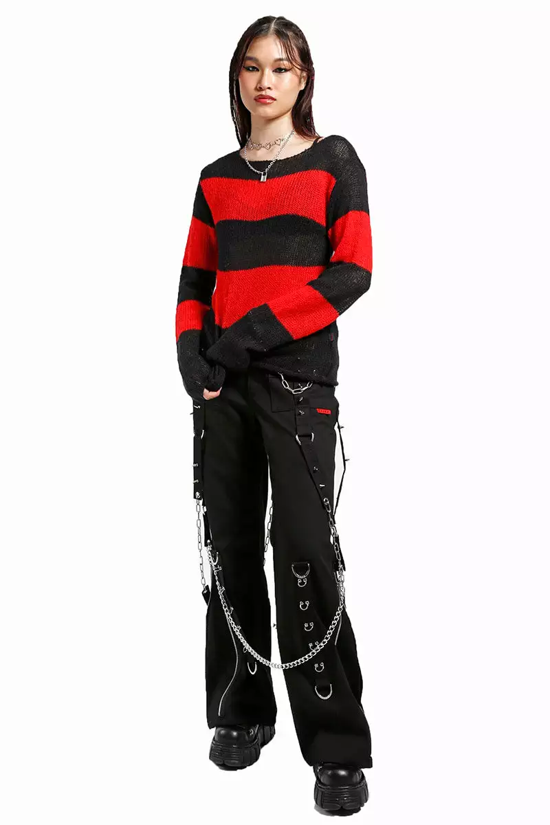 Get chained up these baggy bondage pants, loaded with an arsenal of metal hardware! Zip up the pant legs for a change in style—carry your evil essentials in the pockets. Unleash in the metal rivet spikes, accent straps, and D-ring details. Finished with a baggy fit, pierced with metal to match your black metal heart.