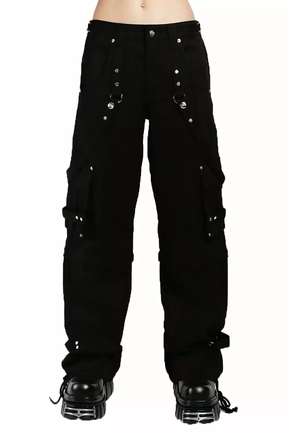 Crush it in these all-black street goth pants! Constructed for creeptures of the night, these baggy bondage pants feature metal studs and detachable straps. Features belt loops, zip fly, and button closure for the perfect punk fit. Tote your goth goodz in the deep pockets—zip off the pant legs to transform these Tripp pants into shorts!